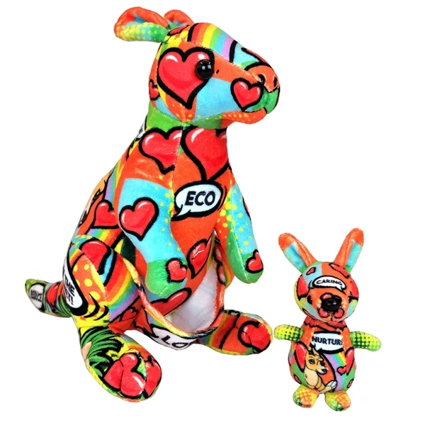 Kangaroos are the largest marsupials on the planet, and with the Message From the Planet Stuffed Kangaroo by Wild Republic, you will get one large and one small ‘roo, because this plush kangaroo comes with a removable Joey in her pouch! Measuring approximately 12 inches, the beautiful mama is covered with red hearts and other pop art-style illustration, as well as a range of speech bubbles that contain relevant earth-friendly words and phrases, while her baby boasts the same cute design on a smaller scale. Made from 100% recycled materials, from their stuffing to their tags, the Message From the Planet Stuffed Kangaroo by Wild Republic also uses soy ink to get their lesson across without causing damage to the planet. A group of kangas is called a mob, but all this stuffed kangaroo and her baby are looking for is a family to call their own, and by giving this pair their forever home, you will be helping to save the earth, too. Interestingly, these marvelous marsupials from Down Under are left-handed, but you will need both of your hands to cuddle up to this cute twosome, because they do come as a package. While many of the smaller kangaroos are considered endangered, thankfully the ones we are used to are plentiful and at no risk, and by taking the Message From the Planet Stuffed Kangaroo by Wild Republic home with you, you’ll be doing something wonderful to ensure it stays that way.